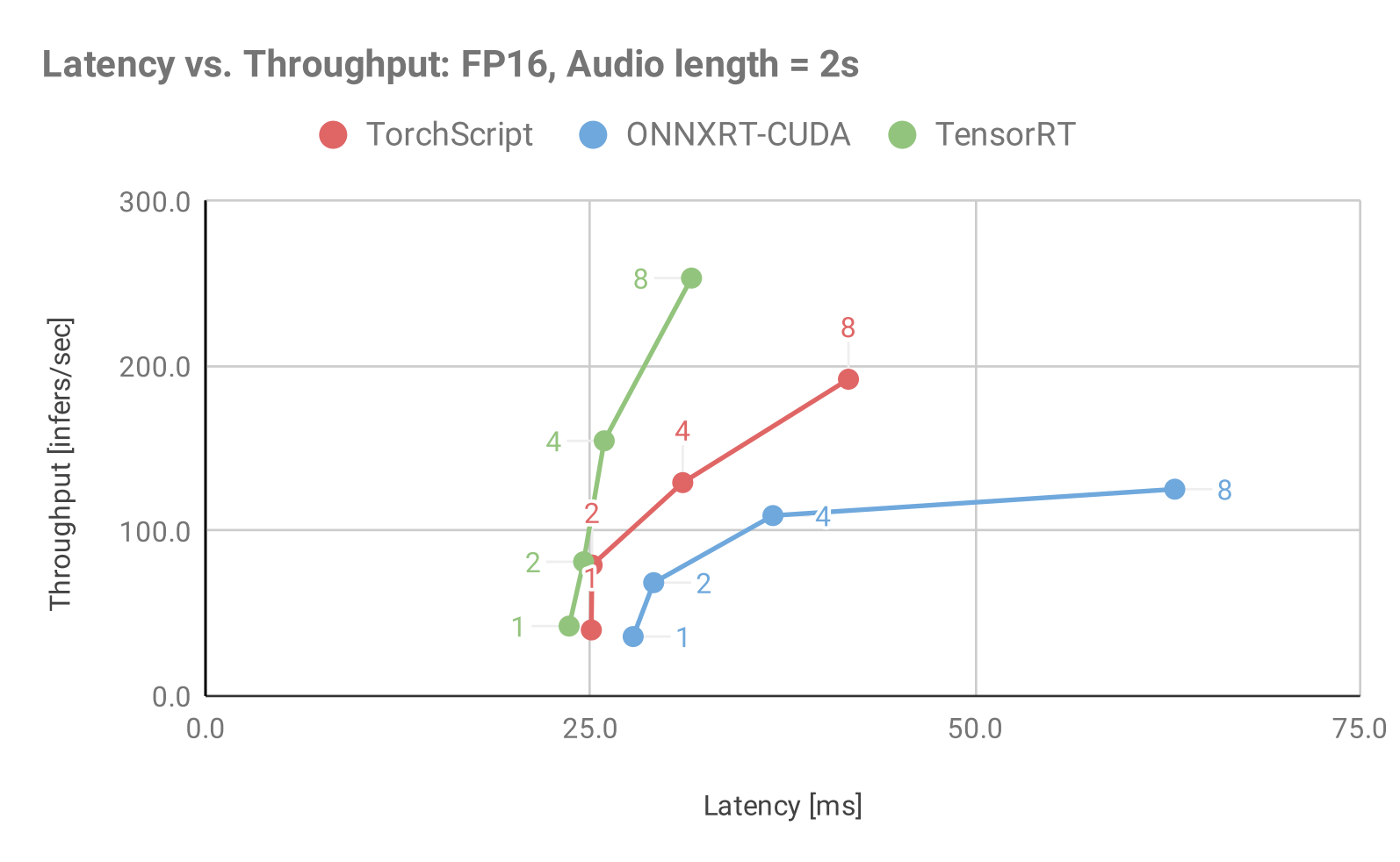 Figure 1: Throughput vs. Latency for Jasper, Audio Length = 2sec using various model backends available in Triton Inference Server and static batching.