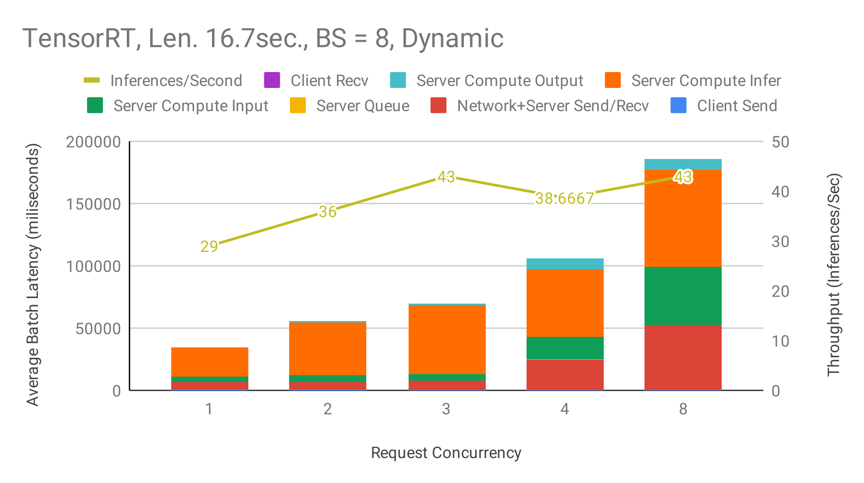 Figures 4, 5, and 6 emphasizes the increase in overall throughput with dynamic batching. At low numbers of concurrent requests, the increased throughput comes at the cost of increasing latency as the requests are queued up to max_queue_delay_microseconds.