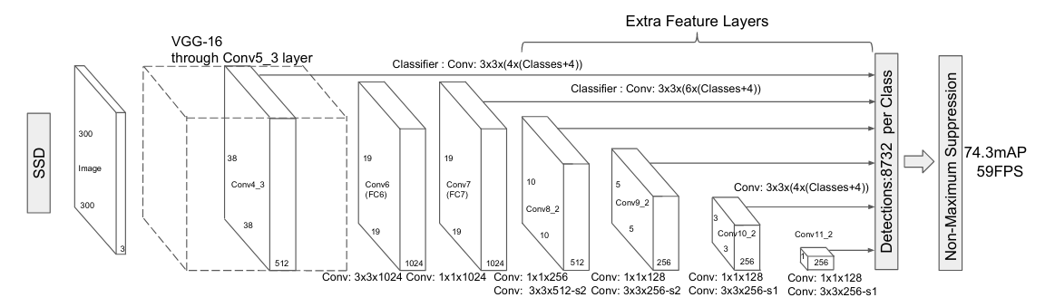 Source: Wei Liu, Dragomir Anguelov, Dumitru Erhan, Christian Szegedy, Scott Reed, Cheng-Yang Fu, Alexander C. Berg, “SSD: Single Shot MultiBox Detector”