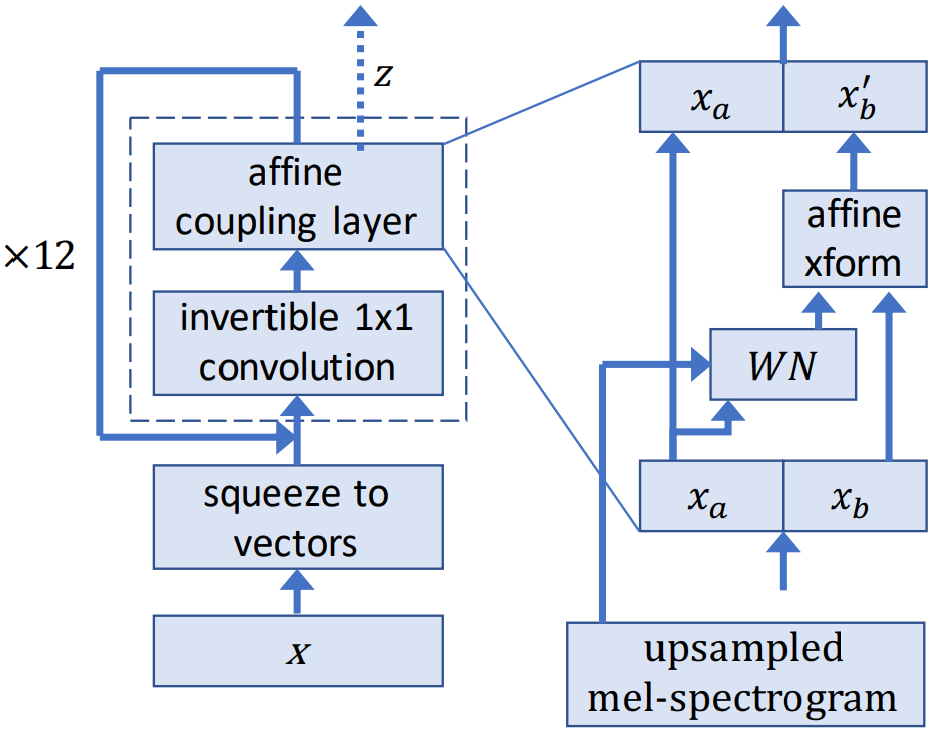 Figure 2. Architecture of the WaveGlow model. Taken from the WaveGlow paper.