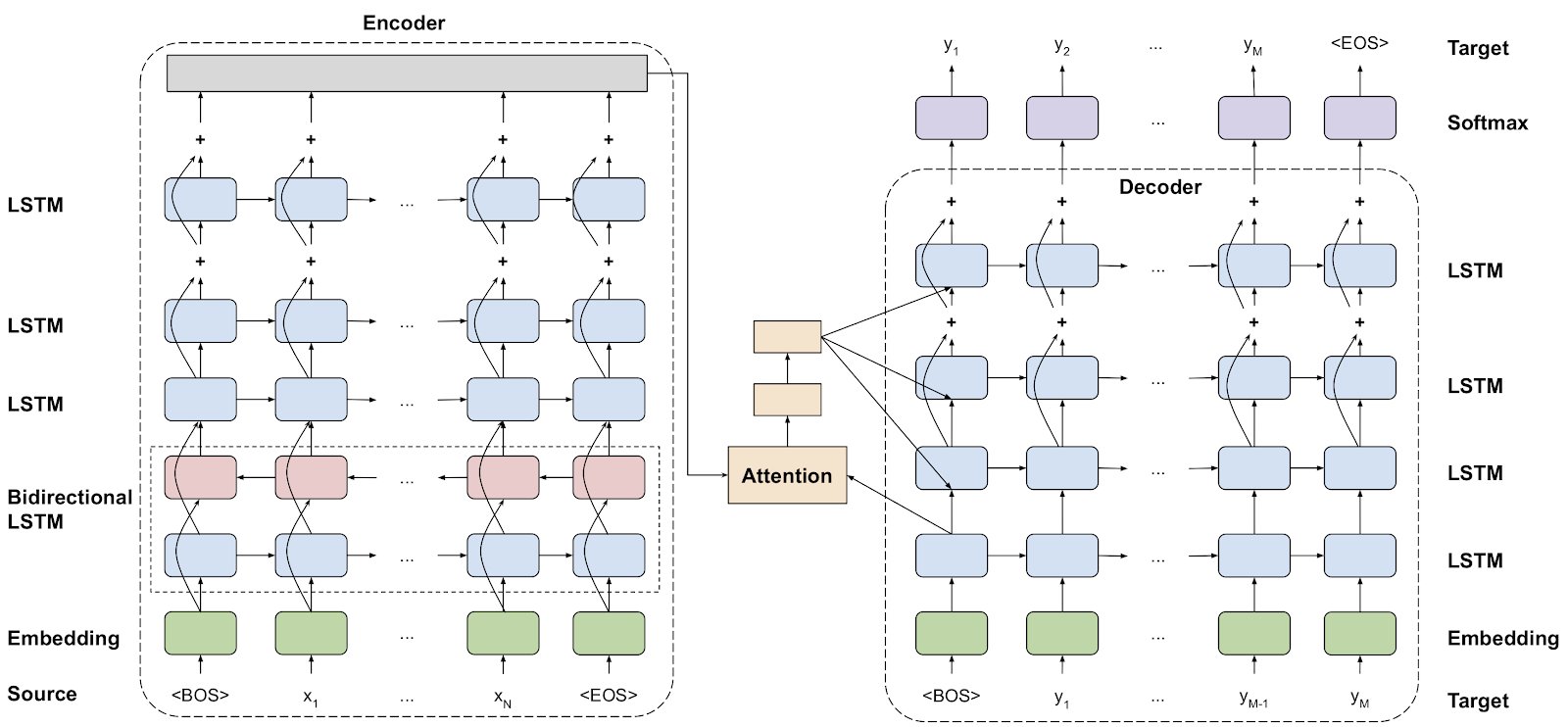 The GNMT v2 model is related to the one addressed in Google's Neural Machine Translation System: Bridging the Gap between Human and Machine Translation paper. The most crucial difference between the two models is in the attention mechanism. In the version2 (v2) model, the decoder's output from the primary LSTM layer goes into the attention module. The re-weighted setting is then concatenated with inputs to all subsequent LSTM layers in the decoder at the present step.
